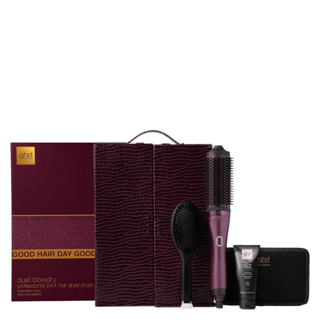 Sjekk inn til glamour denne høytidssesongen med ghd cherry chic-kolleksjonen. Limited edition ghd duet hårføner er badet i en forførende Cherry Chic-farge og inspirert av luksuriøs reise. Festgavesettet inviterer deg til å oppleve forførende og tidløse perfekte hårdager. Inneholder ghd Duet Blowdry™ profesjonell 2-i-1 fønerbørste, ghd Volume Forever™ volumgivende fønekrem, ghd The Dresser Oval Dressing Brush, en rengjøringsbørste, en varmebestandig matte3 og en luksuriøs, reiseinspirert oppbevaringsveske.²